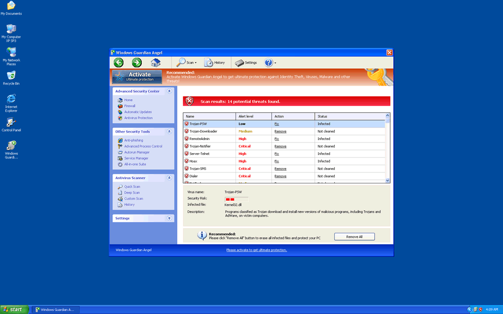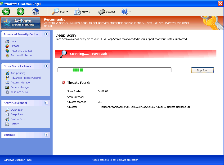 From a cursory inspection, Windows Guardian Angel looks like a safe and full-featured anti-virus program, but this is strictly due to Windows Guardian Angel having copied most of its appearance from a version of Windows Security Center. Windows Guardian Angel can easily afford to tack on many other features that Security Center lacks for the simple reason that these extra features are fraudulent and don't have any purpose except to mislead you about your computer's health. Windows Guardian Angel, unlike a real anti-virus scanner, will display results that list nonexistent infections, as well as pop-ups with inaccurate error messages.