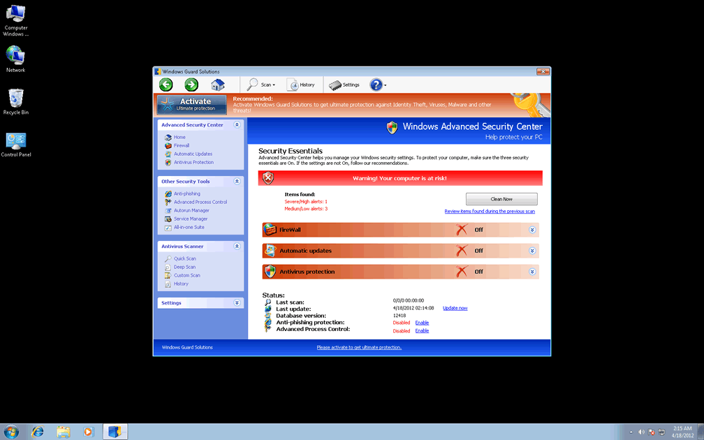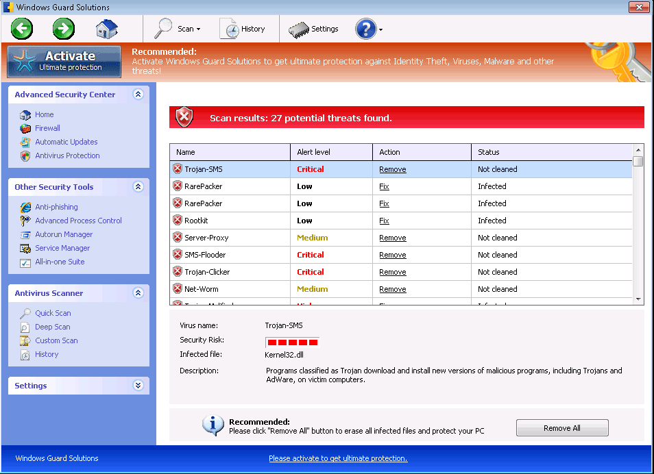 System scans, live pop-up warnings, a memory processes monitor and even protection against phishing attacks are all parts of Windows Guard Solutions's cache of faux security functions, but these features are only functional as far as it's necessary for them to convince you to spend money on Windows Guard Solutions. Like other types of scamware from Win32/FakeVimes, Windows Guard Solutions can only provide fake security information about attacks and PC threats that aren't based on reality. FakeVimes-based PC threats include Privacy Guard Pro, Extra Antivirus, Fast Antivirus 2009, Presto TuneUp, Windows Security Suite, Smart Virus Eliminator, Packed.Generic.245, Volcano Security Suite, Windows Enterprise Suite, Enterprise Suite, Additional Guard, Live PC Care, PC Live Guard, Live Enterprise Suite, Security Antivirus, My Security Wall, CleanUp Antivirus, Smart Security and PrivacyGuard Pro 2.0.