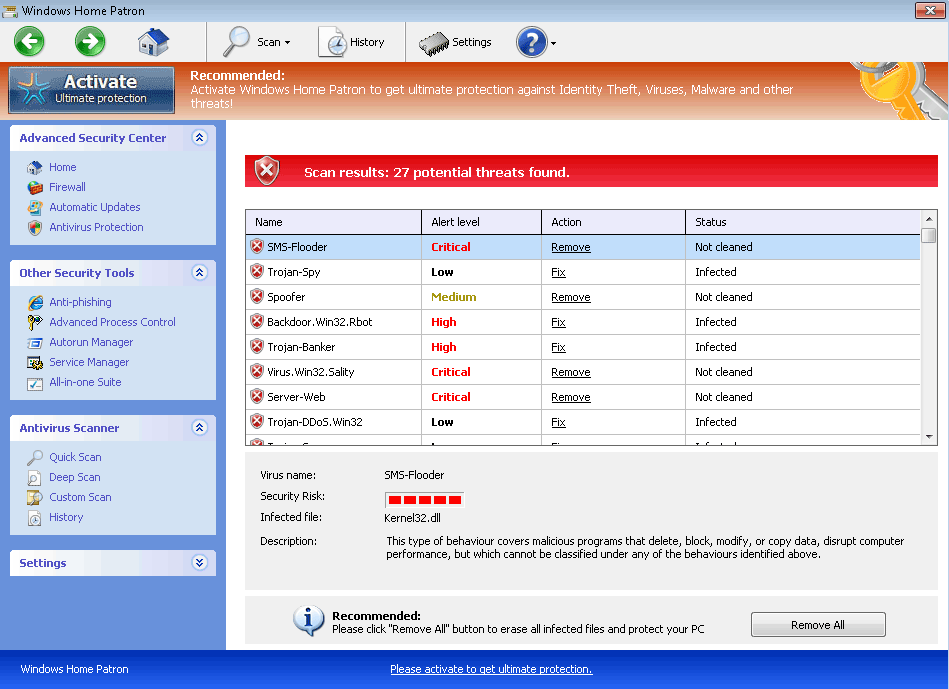 As a fraudulent anti-malware program, Windows Home Patron is unable to provide any of the security functions that Windows Home Patron appears to possess, but any Windows Home Patron infection will always include Windows Home Patron's attempts at faking the same with inaccurate system information. Windows Home Patron's anti-malware pretenses can include both fake system scans and several variants of pop-ups that alert you to keyloggers, Trojans, damaged Windows components and live attacks against your PC's confidential information. Under all circumstances, SpywareRemove.com malware analysts encourage you to ignore security information that's provided by Windows Home Patron or related PC threats. However, this information is never accurate and may lead you to damage uninfected files if you attempt to follow Windows Home Patron's advice.