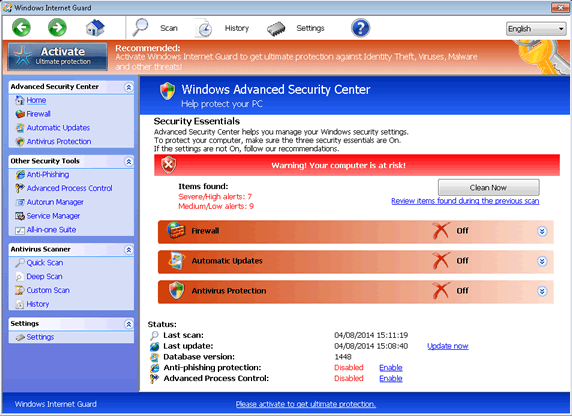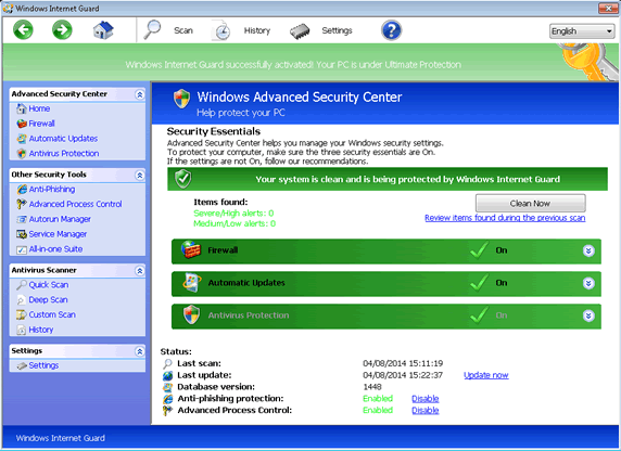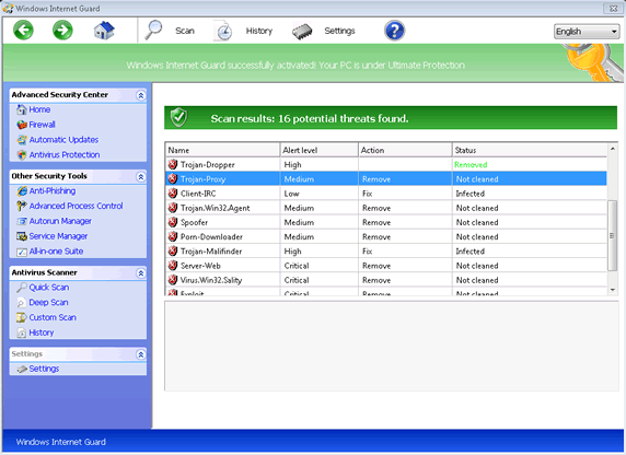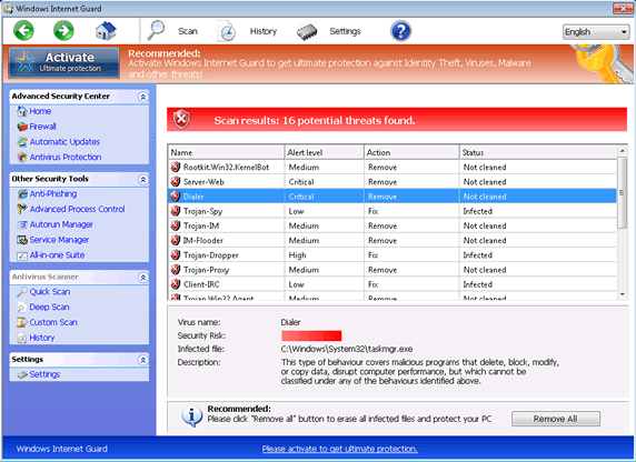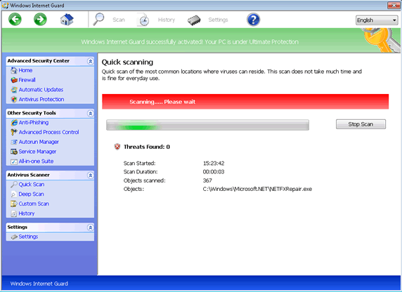 - Like all fake system scanners, Windows Internet Guard also may imitate scans that use predetermined, negative results. Windows Internet Guard will claim that various files are infected with other high-level threats.