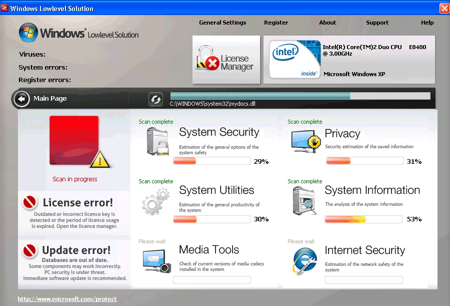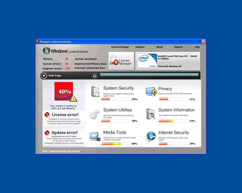 Installing Windows Lowlevel Solution or another rogue security program by accident leads to the following symptoms: