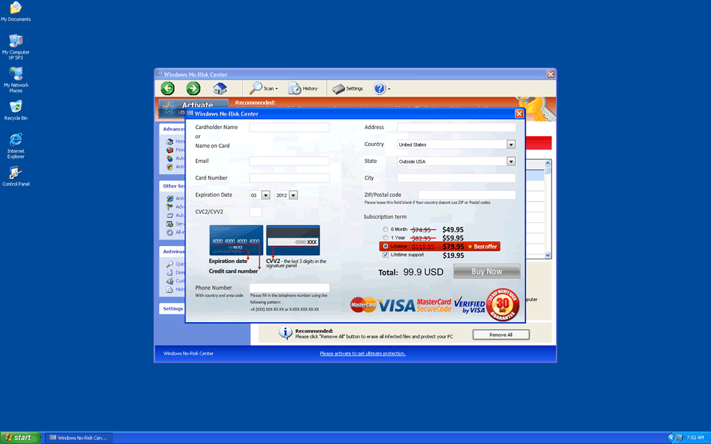 Windows No-Risk Center may keep up a perfect appearance of being a put-upon security program, but information that Windows No-Risk Center provides is always fraudulent. Since Windows No-Risk Center's intent is to scare you into spending money on its full version, SpywareRemove.com malware analysts strongly encourage you to disregard any sales pitches that Windows No-Risk Center may make along with its alerts about fake PC threats.