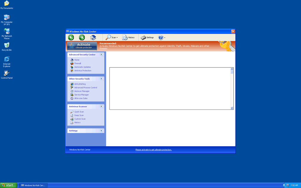 \Windows No-Risk Center looks very similar to Microsoft's own Security Center, and, on a first look, appears to include system scanning features, phishing protection and other security functions of generic value. However, the real point of Windows No-Risk Center isn't to keep your PC safe – in fact, it's the opposite, since SpywareRemove.com malware researchers have confirmed Windows No-Risk Center's ability to block anti-malware and security programs at a whim. Similar security issues have also been noted with other members of the FakeVimes or Rogue.VirusDoctor family, such as Windows No-Risk Center, Privacy Guard Pro, Extra Antivirus, Fast Antivirus 2009, Presto TuneUp, Windows Security Suite, Smart Virus Eliminator, Packed.Generic.245, Volcano Security Suite, Windows Enterprise Suite, Enterprise Suite, Additional Guard, Live PC Care, PC Live Guard, Live Enterprise Suite, Security Antivirus, My Security Wall, CleanUp Antivirus, Smart Security and PrivacyGuard Pro 2.0.