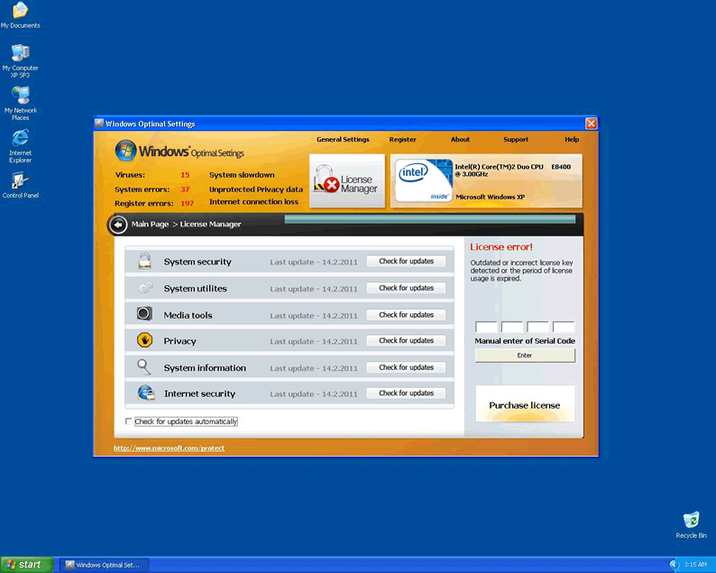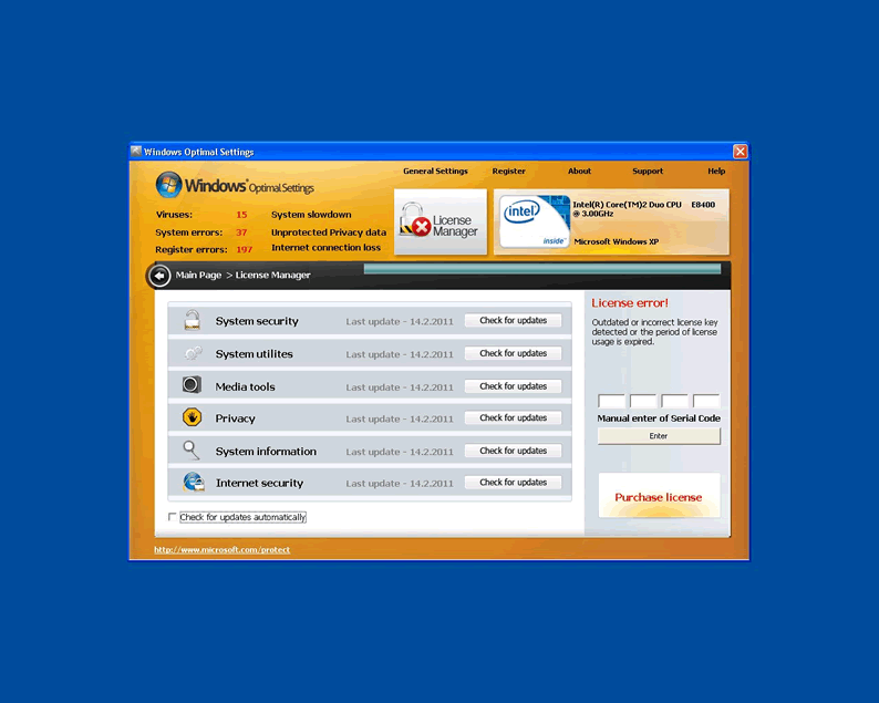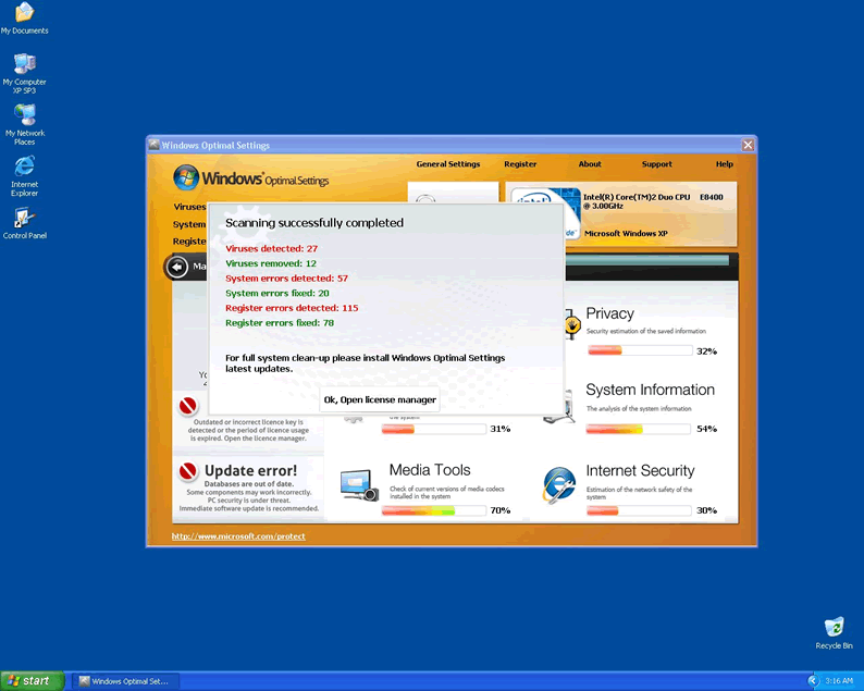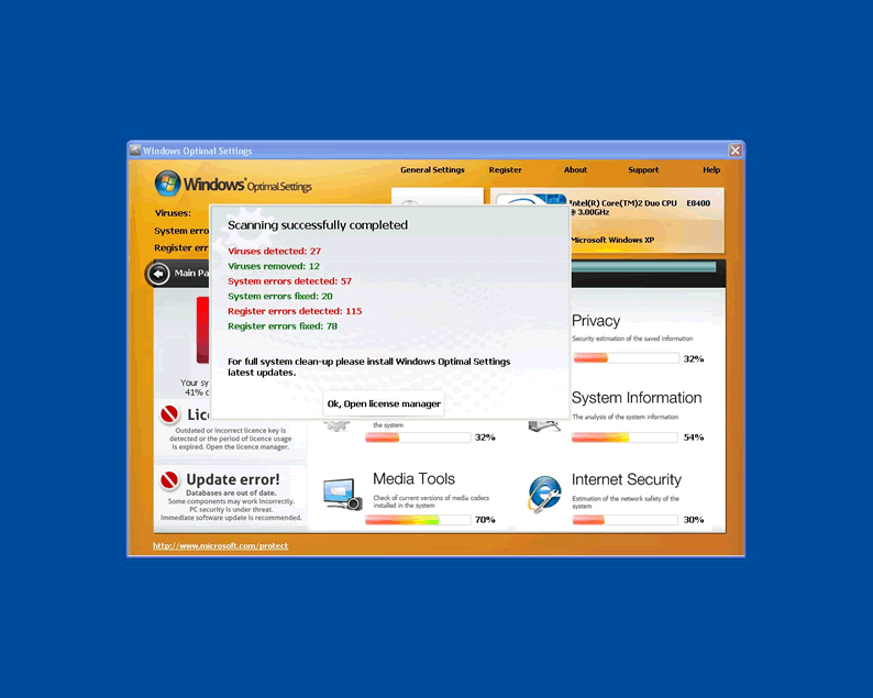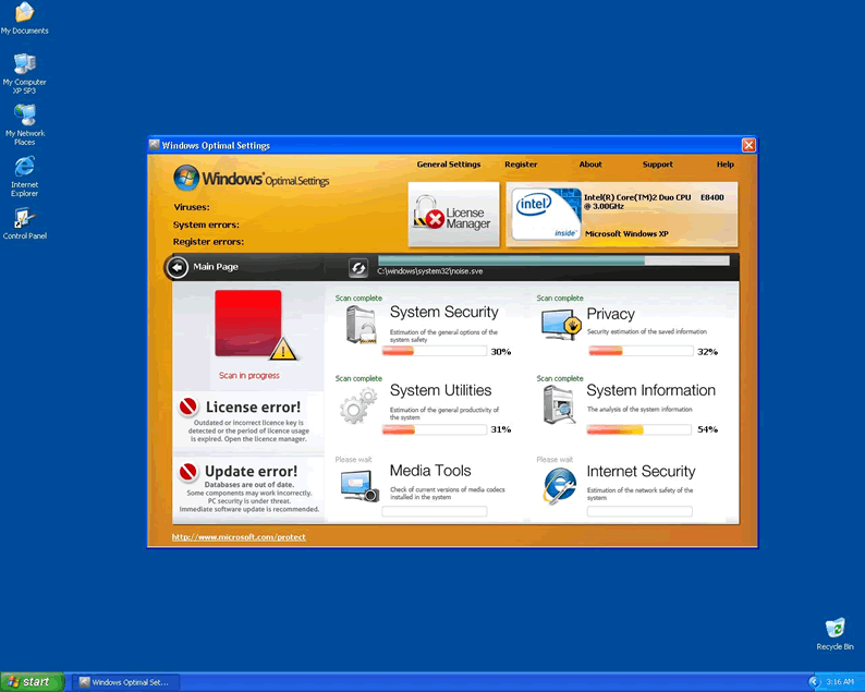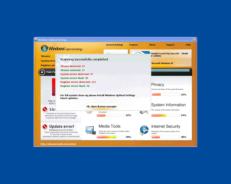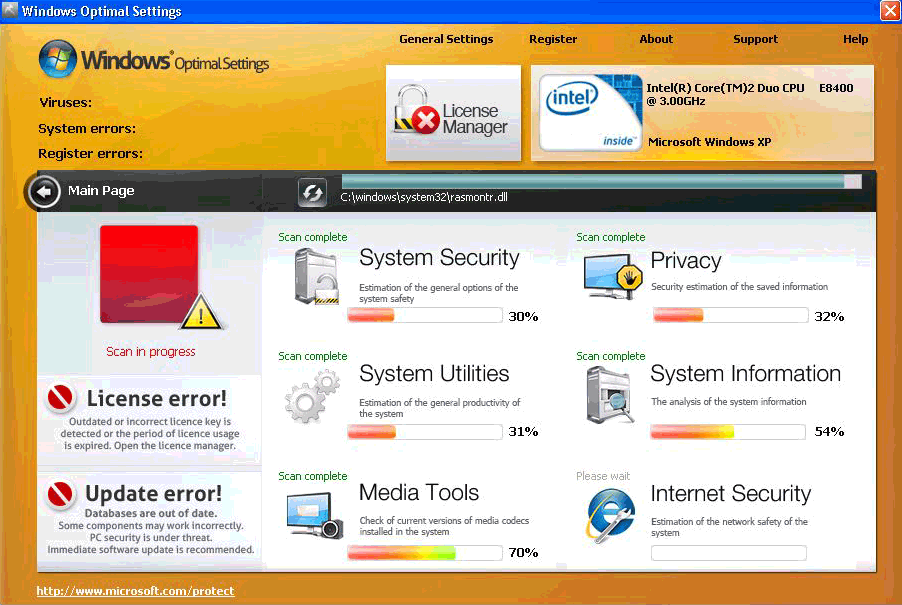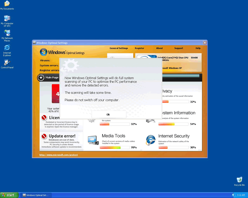 Windows Optimal Settings was primarily designed by hackers to sell a fake license for this scrupulous program. Windows Optimal Settings does not actually perform any of the functions that it claims to such as scanning your computer for parasites and fixing system issues. Instead, Windows Optimal Settings attempts to rope computer users in through use of aggressive popup messages and falsified system scan results. It is only logical to take action to detect and remove Windows Optimal Settings with a spyware removal tool that is designed to eliminate the threat of rogue anti-spyware programs.