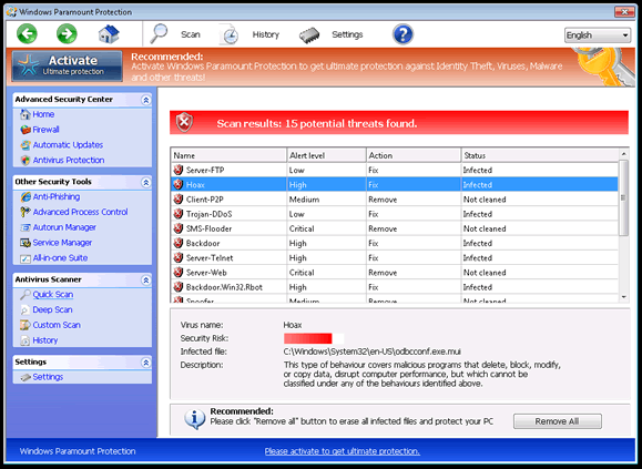 Windows Paramount Protection is a rogue security program that provides general anti-malware warnings, system scans and other characteristics that would be anticipated of a PC security suite. However, unbeknownst to some of its victims, Windows Paramount Protection delivers fraudulent information about fake infections while Windows Paramount Protection attacks your computer, downgrading its real security and hindering your access to other programs. Although Windows Paramount Protection's criminals would like you to give in and purchase Windows Paramount Protection to make these attacks stop, malware experts recommend a cheaper and safer solution: using legitimate anti-malware techniques and software to block and then uninstall Windows Paramount Protection.