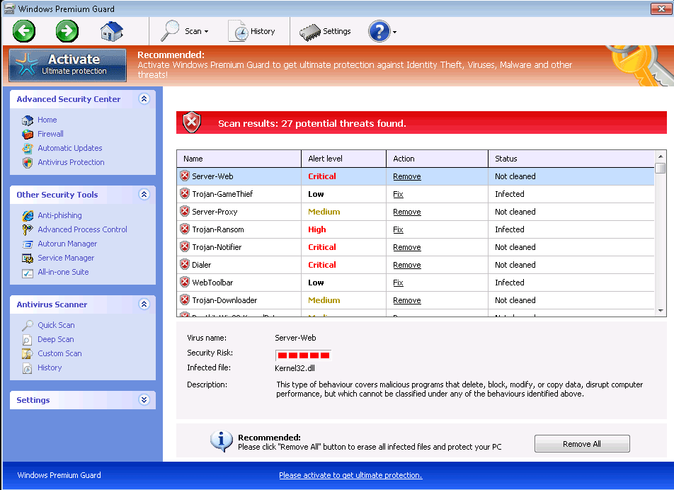 Unlike real anti-virus software, Windows Premium Guard will also launch itself with Windows and eschews giving you any way to disable this startup routine by normal methods. This can be problematic when attempting to remove Windows Premium Guard, since SpywareRemove.com malware researchers have found that scamware from Windows Premium Guard's family can also create security issues such as: