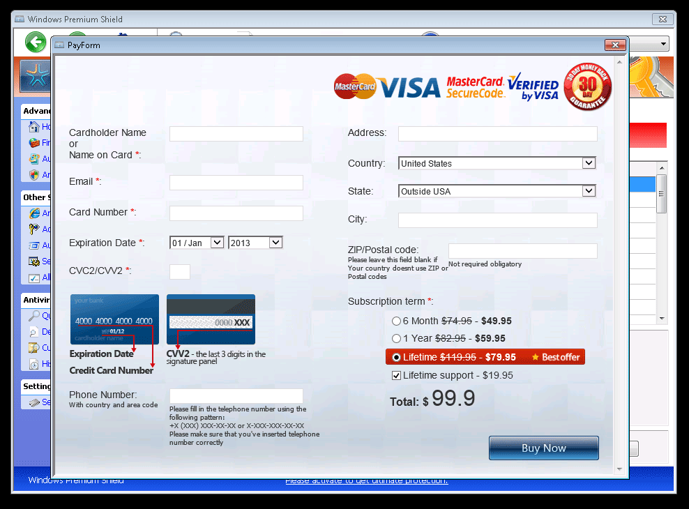 While legitimate anti-malware products strive to make your PC as safe as possible, Windows Premium Shield performs the opposite functions, and malware researchers consider Windows Premium Shield a threat on the same level as any Trojan, rootkit or worm. Nor is Windows Premium Shield the only type of rogue anti-malware program you should worry about attacking your PC; the FakeVimes family is full of many similar scamware products, including Privacy Guard Pro, Extra Antivirus, Fast Antivirus 2009, Presto TuneUp, Windows Security Suite, Smart Virus Eliminator, Packed.Generic.245, Volcano Security Suite, Windows Enterprise Suite, Enterprise Suite, Additional Guard, Live PC Care, PC Live Guard, Live Enterprise Suite, Security Antivirus, My Security Wall, CleanUp Antivirus, Smart Security and PrivacyGuard Pro 2.0. None of these fraudulent security products ever should be bought or given any confidential information.