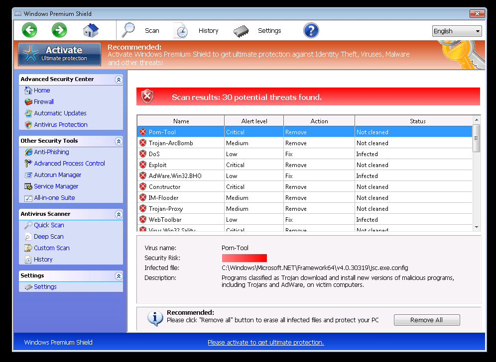 When removing Windows Security System, the first order of business usually will be to launch an anti-malware program that may be blocked by Windows Premium Shield. You can do this by disabling Windows Security System, itself, through Safe Mode or alternative standard security tactics. Malware researchers recommend using the most extended and thorough scanning options that are available, since deleting Windows Security System also may cause you to run across any number of supporting Trojans, and other PC threats.