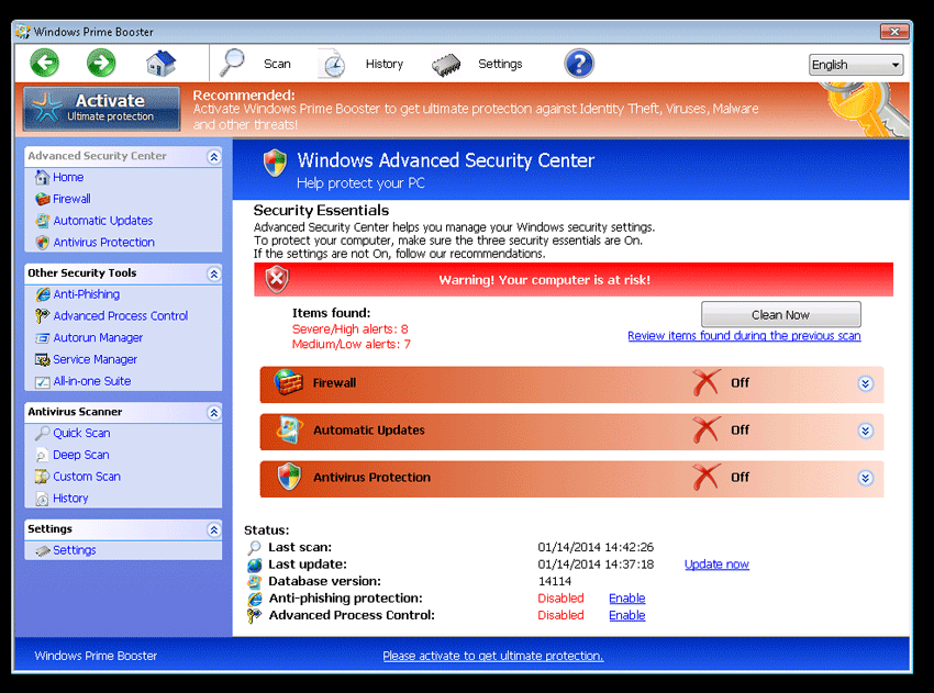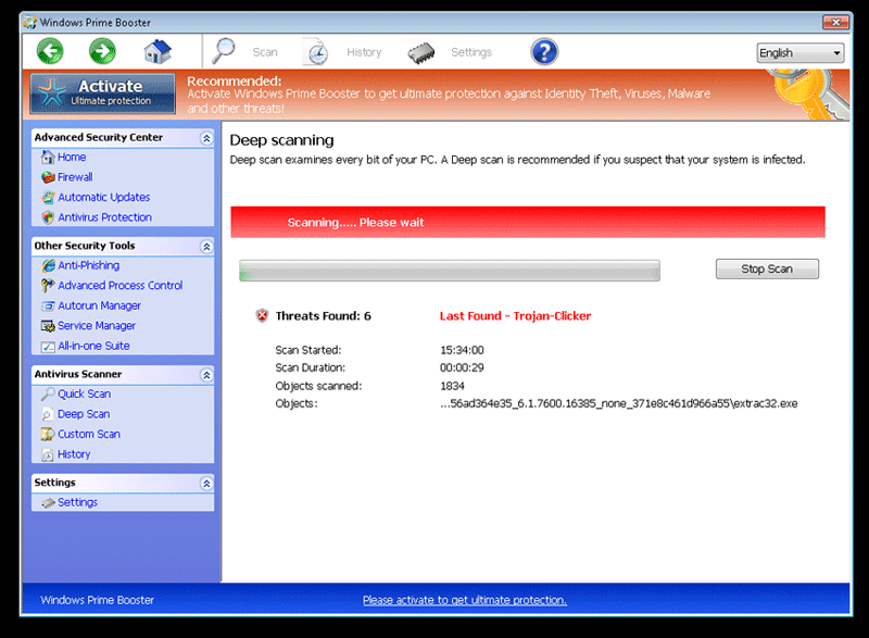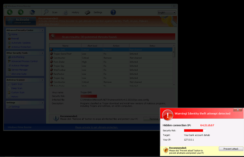 Fake anti-malware scanners such as Privacy Guard Pro, Extra Antivirus, Fast Antivirus 2009, Presto TuneUp, Windows Security Suite, Smart Virus Eliminator, Packed.Generic.245, Volcano Security Suite, Windows Enterprise Suite, Enterprise Suite, Additional Guard, Live PC Care, PC Live Guard, Live Enterprise Suite, Security Antivirus, My Security Wall, CleanUp Antivirus, Smart Security and PrivacyGuard Pro 2.0., among others, while almost as common as sand on a shoreline, also require ignorance on the part of their victims to achieve their strategies. As another form of fake anti-malware program, Windows Prime Booster uses a new name, but otherwise appears to be identical to the many, previous examples of the FakePAV family. Although Windows Prime Booster looks exactly like a real anti-malware scanner, threats detected through Windows Prime Booster's scans are fake, and its pop-up warnings are meant to confuse and frighten, not educate.