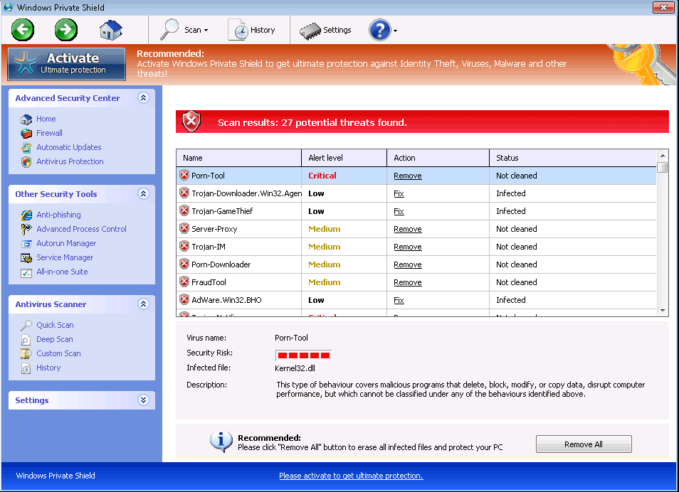 These attacks are also typical to other members of Win32/FakeVimes, which also share Windows Private Shield's appearance. Telltale signs to identify Windows Private Shield and its clones include their 'Advanced Process Control' feature, 'All-in-one Suite' and 'ACTIVATE Ultimate Protection' button, which offer a shortcut to a fraudulent registration process. You should never purchase, download or register Windows Private Shield, since SpywareRemove.com malware experts have confirmed its lack of security-related features in both its registered and unregistered form. Windows Private Shield is a rogue anti-spyware scanner that's closely related to PC threats like Privacy Guard Pro, Extra Antivirus, Fast Antivirus 2009, Presto TuneUp, Windows Security Suite, Smart Virus Eliminator, Packed.Generic.245, Volcano Security Suite, Windows Enterprise Suite, Enterprise Suite, Additional Guard, Live PC Care, PC Live Guard, Live Enterprise Suite, Security Antivirus, My Security Wall, CleanUp Antivirus, Smart Security and PrivacyGuard Pro 2.0.