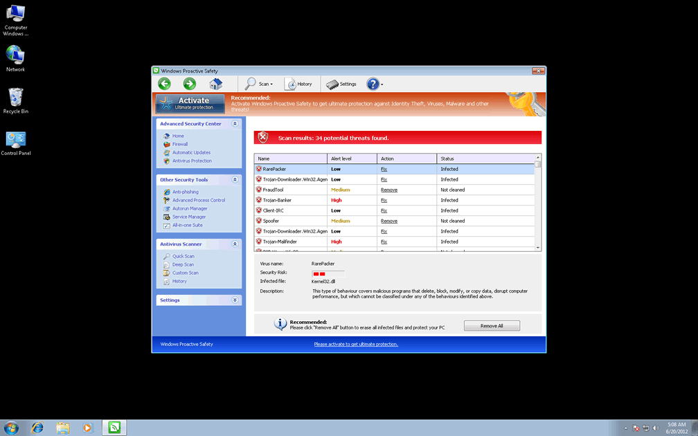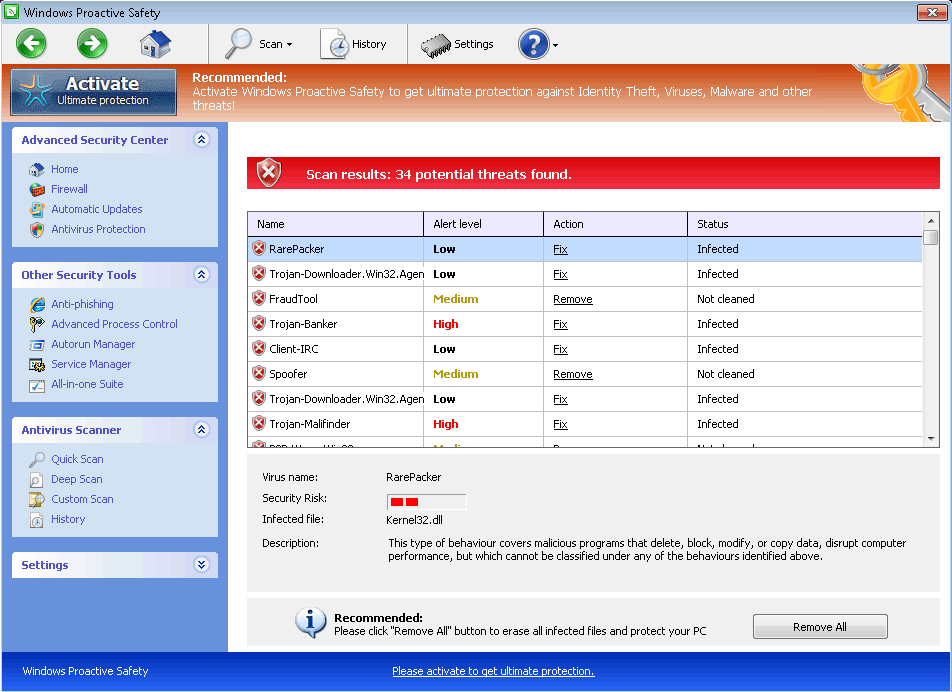 Windows Proactive Safety is a typical example of modern variants from the family of scamware that's labeled FakeVimes or FakeVimes, which members include Privacy Guard Pro, Extra Antivirus, Fast Antivirus 2009, Presto TuneUp, Windows Security Suite, Smart Virus Eliminator, Packed.Generic.245, Volcano Security Suite, Windows Enterprise Suite, Enterprise Suite, Additional Guard, Live PC Care, PC Live Guard, Live Enterprise Suite, Security Antivirus, My Security Wall, CleanUp Antivirus, Smart Security and PrivacyGuard Pro 2.0. Although Windows Proactive Safety and similar PC threats are often marketed by fake online scanners, SpywareRemove.com malware researchers warn that Windows Proactive Safety can also be installed by separate PC threats, especially those that piggyback on download links for popular codecs and movie player updates. Windows Proactive Safety's most visible behavior includes launching itself without your permission as soon as Windows starts, and then using this vantage point to display inaccurate pop-up warnings and system scans.