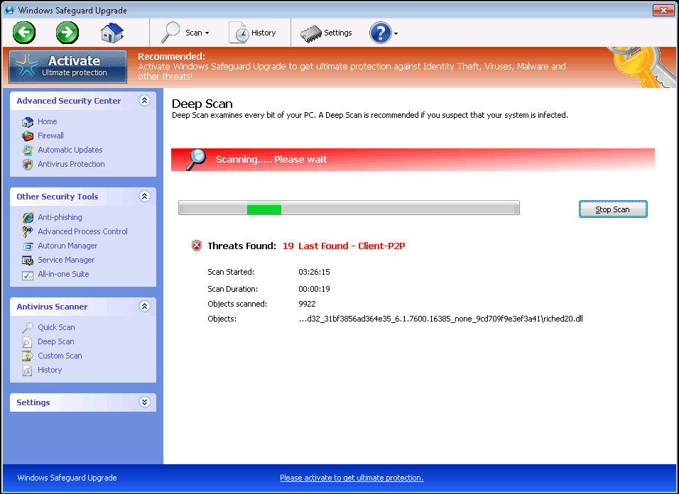 For those who aren't familiar with scamware based on recent templates from Win32/FakeVimes, Windows Safeguard Upgrade may look like a convincing and surprisingly fully-featured anti-virus scanner with inclusions such as defenses against phishing attacks and a memory process utility. Sadly, Windows Safeguard Upgrade's real features belie its appearance, given that Windows Safeguard Upgrade, like all members of its family, is incapable of giving you any type of protection from PC threats or accurate identification of the same. SpywareRemove.com malware researchers have found that, after Windows Safeguard Upgrade uses typical Windows Registry exploits to launch itself automatically, Windows Safeguard Upgrade will display a range of different fake security alerts, including scanner results that always contain non-present types of malware. Some of the many clones of Windows Safeguard Upgrade are Privacy Guard Pro, Extra Antivirus, Fast Antivirus 2009, Presto TuneUp, Windows Security Suite, Smart Virus Eliminator, Packed.Generic.245, Volcano Security Suite, Windows Enterprise Suite, Enterprise Suite, Additional Guard, Live PC Care, PC Live Guard, Live Enterprise Suite, Security Antivirus, My Security Wall, CleanUp Antivirus, Smart Security and PrivacyGuard Pro 2.0.