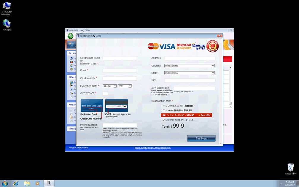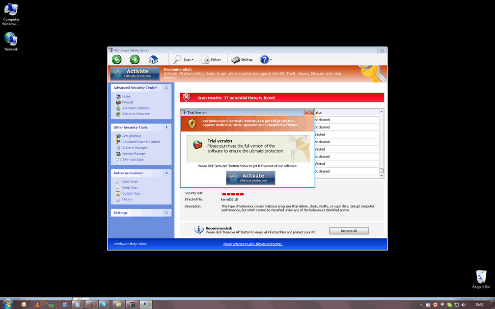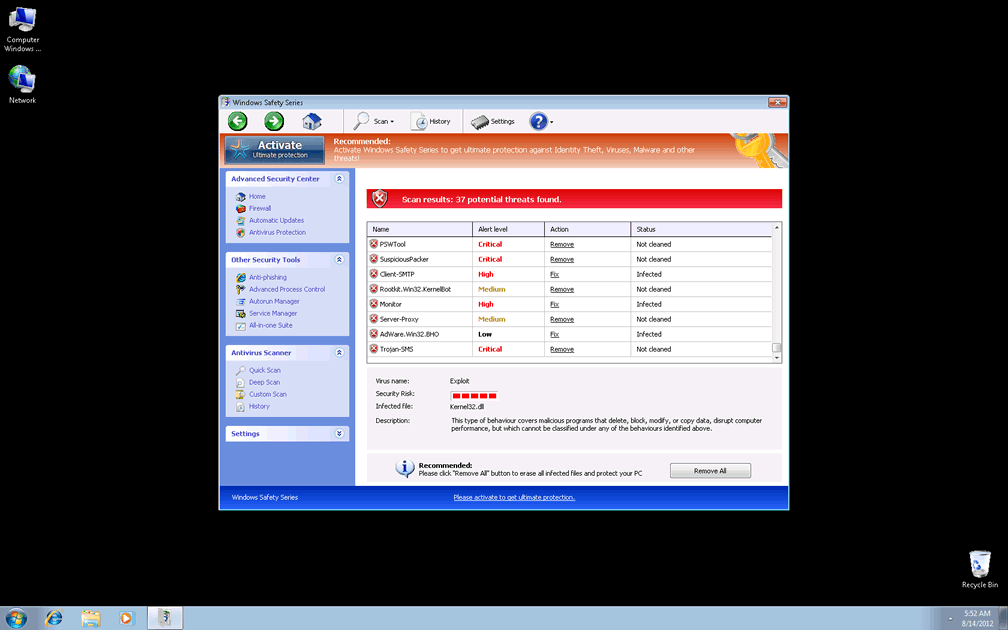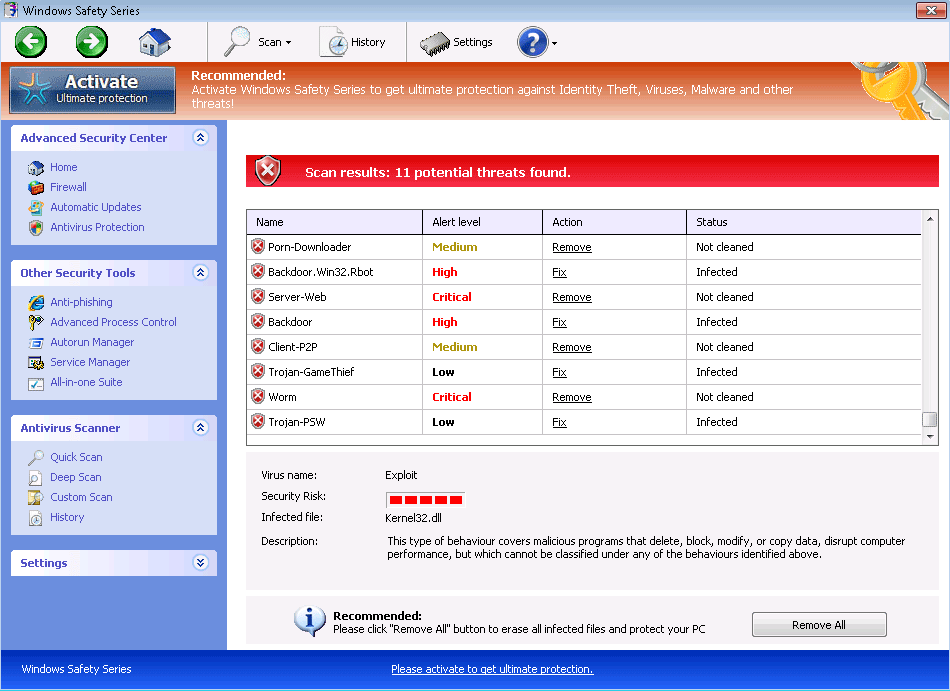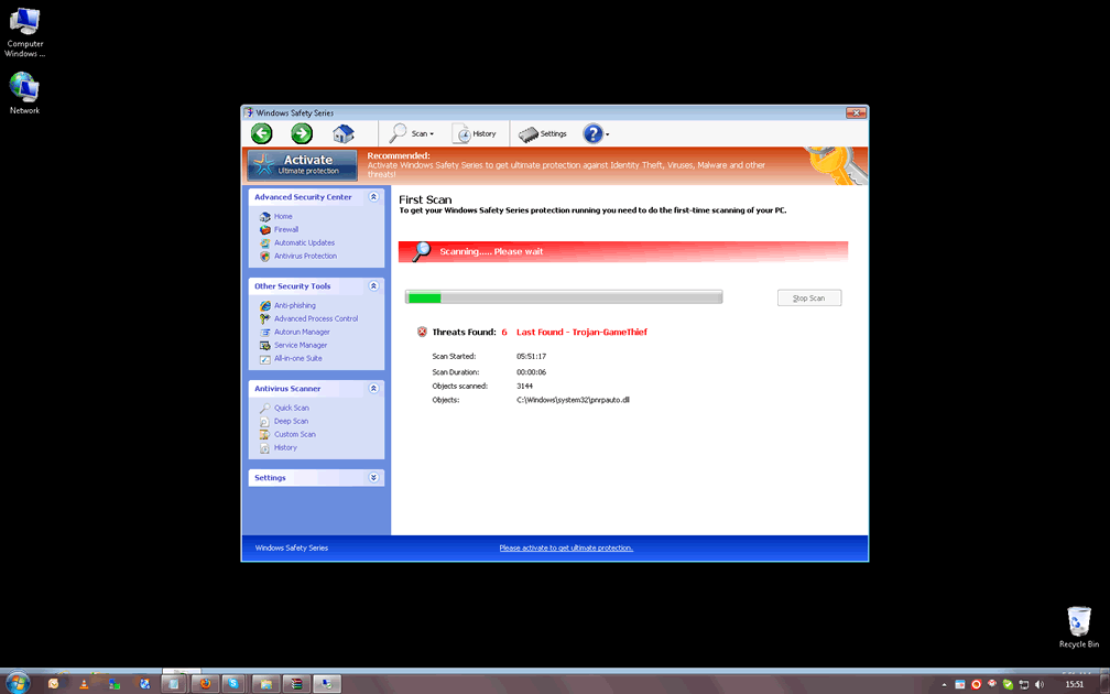 While Windows Safety Series has a name that would make one inclined to trust it, Windows Safety Series is simply a clone of other types of equally-fake anti-malware scanners from the FakeVimes that display inaccurate information about threats attacking your PC. Most recent versions of rogue anti-malware programs from Windows Safety Series's family include identical interfaces, and can be identified by names such as Privacy Guard Pro, Extra Antivirus, Fast Antivirus 2009, Presto TuneUp, Windows Security Suite, Smart Virus Eliminator, Packed.Generic.245, Volcano Security Suite, Windows Enterprise Suite, Enterprise Suite, Additional Guard, Live PC Care, PC Live Guard, Live Enterprise Suite, Security Antivirus, My Security Wall, CleanUp Antivirus, Smart Security and PrivacyGuard Pro 2.0.
