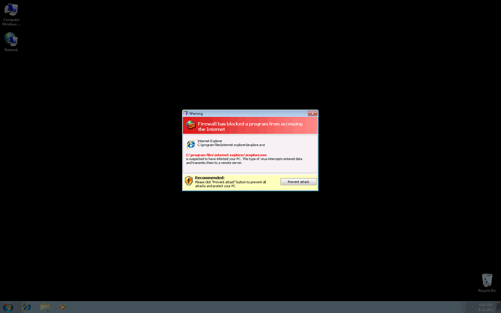 | 2 | Warning Firewall has blocked a program from accessing the Internet Windows XP USER API Clien: DLL User32.dll User32.dll is suspended to have infected your PC. This type of virus intercepts entered data and transmits them to a remote server. Recommended: Please click “Prevent attack” button to prevent all attacks and protect your PC. |