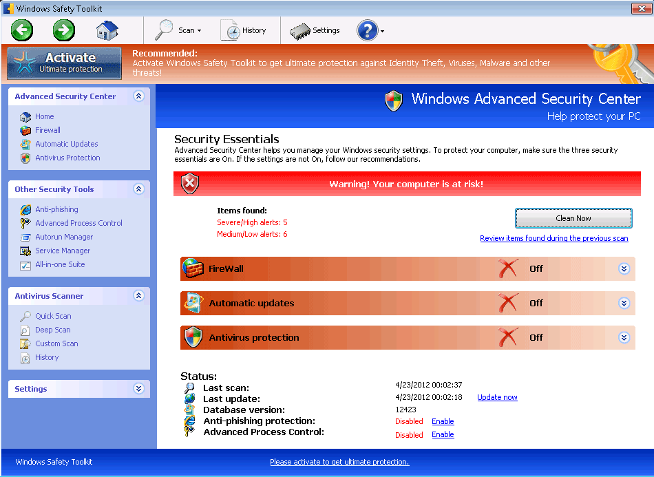 Windows Safety Toolkit markets itself as an anti-virus scanner with a good-sized parcel of other security features, and even includes seemingly advanced functions like phishing attack defenses, but these features are entirely fraudulent and their self-destructive advice should always be disregarded. System scans will include warnings about nonexistent infections, popup alerts will threaten you about live attacks that aren't occurring and various programs may be announced as infected. SpywareRemove.com malware experts note that the latter is particularly likely for security programs that Windows Safety Toolkit intentionally blocks (such as anti-virus scanners and Windows diagnostic applications).