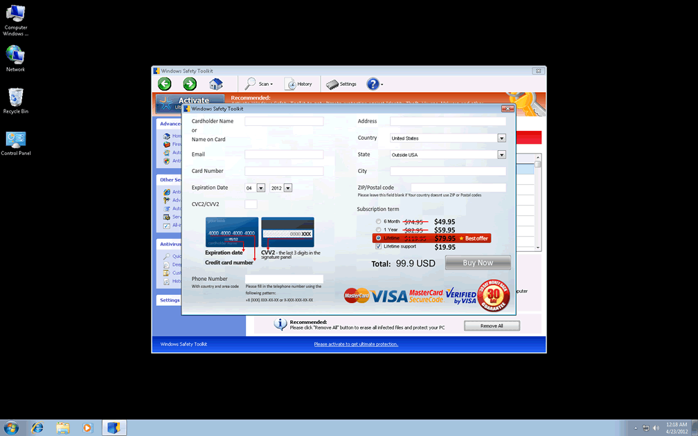 While fake pop-ups and other types of inaccurate security information are Windows Safety Toolkit's definitive symptoms, as a member of Win32/FakeVimes, Windows Safety Toolkit may also launch other attacks against your PC. Besides Windows Safety Toolkit, this family also includes such members as Privacy Guard Pro, Extra Antivirus, Fast Antivirus 2009, Presto TuneUp, Windows Security Suite, Smart Virus Eliminator, Packed.Generic.245, Volcano Security Suite, Windows Enterprise Suite, Enterprise Suite, Additional Guard, Live PC Care, PC Live Guard, Live Enterprise Suite, Security Antivirus, My Security Wall, CleanUp Antivirus, Smart Security and PrivacyGuard Pro 2.0. If desired, you can also register Windows Safety Toolkit or its relatives with the code '0W000-000B0-00T00-E0020,' as SpywareRemove.com malware analysts have found this to be occasionally useful for removing Windows Safety Toolkit and other scamware from Win32/FakeVimes.