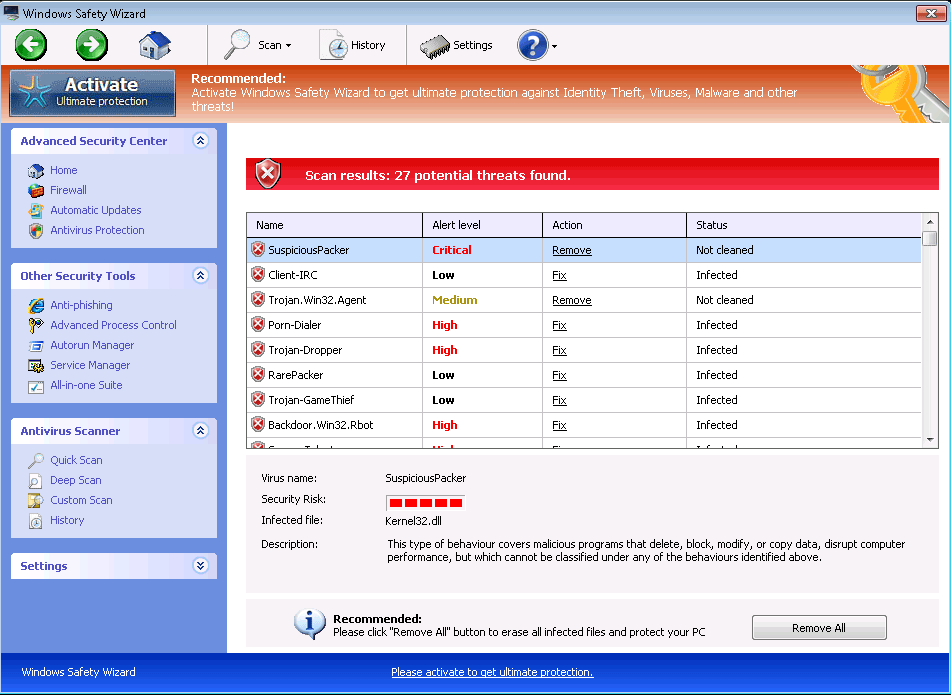 Windows Safety Wizard may seem to have more security features than the average anti-virus scanner, but this is purely due to all of Windows Safety Wizard's being empty promises cloned from previous versions of FakeVimes-built scamware. Identical types of rogue security products include Privacy Guard Pro, Extra Antivirus, Fast Antivirus 2009, Presto TuneUp, Windows Security Suite, Smart Virus Eliminator, Packed.Generic.245, Volcano Security Suite, Windows Enterprise Suite, Enterprise Suite, Additional Guard, Live PC Care, PC Live Guard, Live Enterprise Suite, Security Antivirus, My Security Wall, CleanUp Antivirus, Smart Security and PrivacyGuard Pro 2.0. Shared (and fake) features such as an anti-phishing defense and an Advanced Process Control can help you to identify Windows Safety Wizard and its close relatives, although actual deletion of Windows Safety Wizard and other members of FakeVimes should always use anti-malware programs when practical.