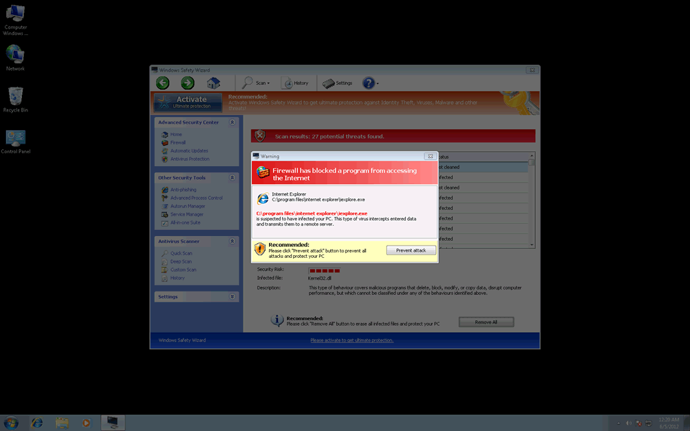 - Fake system scans that always return unrealistically huge lists of high-level PC threats such as rootkits and banking Trojans.