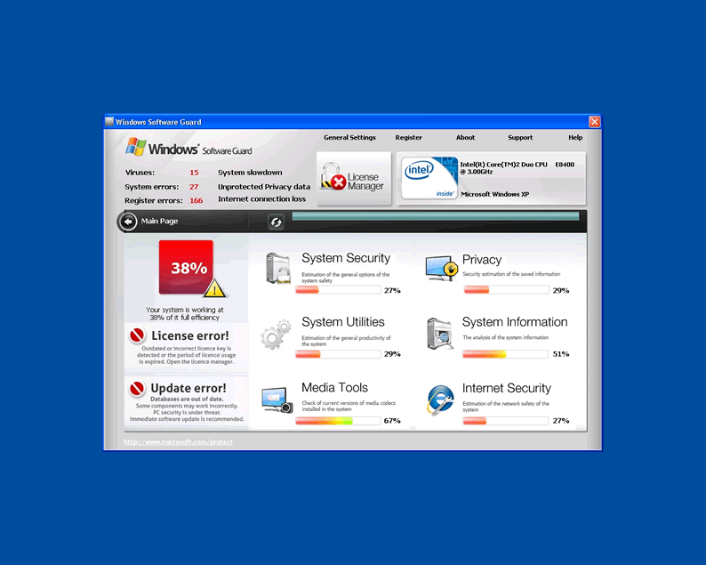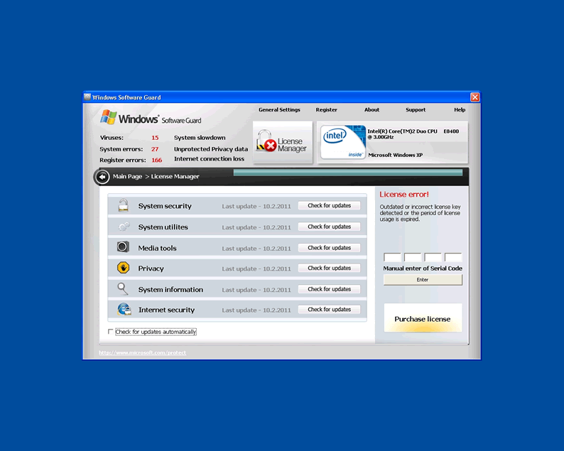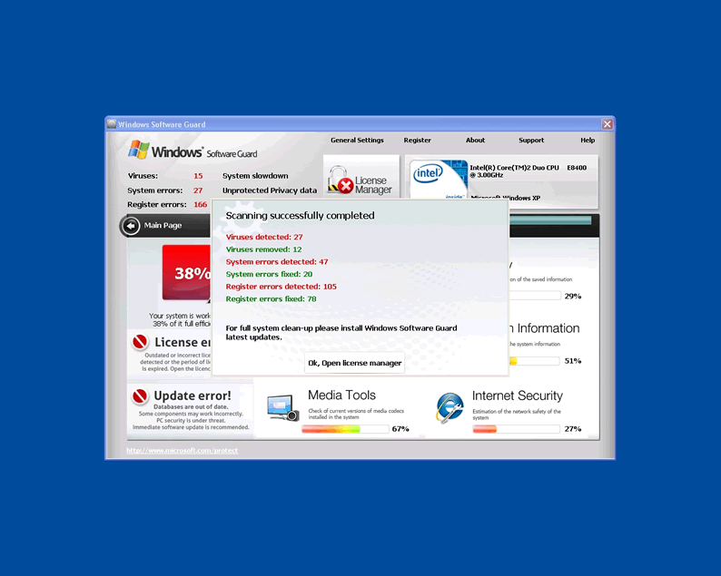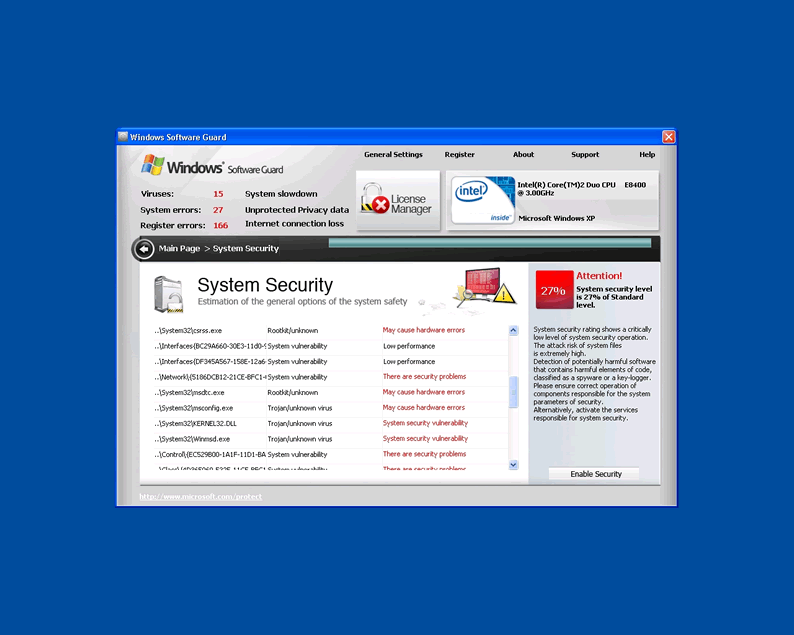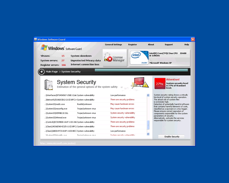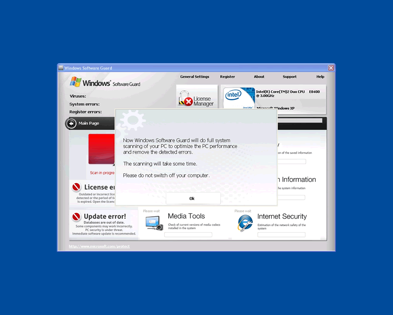 Note the typo! At this point, Fake Microsoft Security Essentials may install a rogue anti-spyware program from a wide possible range. Right now there's over half a dozen possible rogue programs served up onto unwilling hard drives this way, and the number is growing almost every week! The dice are rolled, and sometimes Windows Software Guard pops up. Rogue anti-spyware programs use deception to acquire the user's cash. By keeping yourself well-informed on this delivery method, you can protect your system from all rogue anti-spyware programs sharing it, including Windows Software Guard.