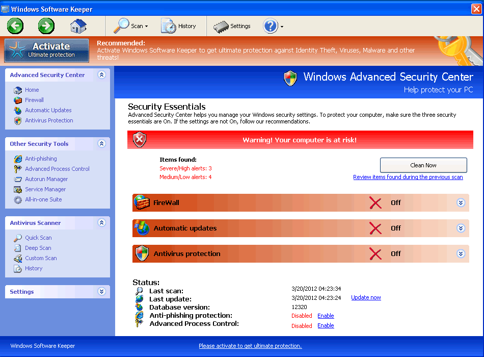 Windows Software Keeper is a fake anti-virus application that imitates Microsoft's Security Center in its quest to defraud you of your money and incite fear with its inaccurate warning messages. Because Windows Software Keeper is also capable of blocking security-related programs and redirecting your browser, SpywareRemove.com malware researchers consider Windows Software Keeper a medium-level threat to your computer's security and recommend its immediate removal. To guarantee that all components and setting changes that are linked to a Windows Software Keeper infection are removed, you should deactivate Windows Software Keeper's startup routine and scan your hard drive with a fully updated anti-malware program of your choice. Actually purchasing Windows Software Keeper will not only waste your cash, but also risk your finances in future frauds, and security-related information that Windows Software Keeper offers should never be considered to be worth even a penny of your savings.
