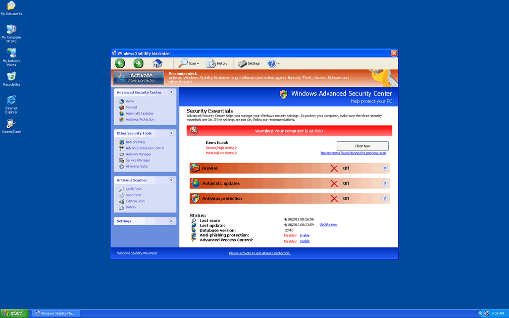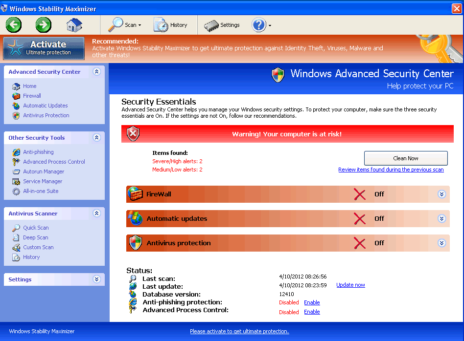 Windows Stability Maximizer looks similar to legitimate anti-malware software and even seems to include standardized features like automatic updates and system scans along with more unusual functions (most notably, an Advanced Process Control that subverts Task Manager). However, these appearances are all part of Windows Stability Maximizer's plan to provide fake system information, including inaccurate alerts about attacks against your PC, the presence of various PC threats and other security issues that aren't even remotely real. Because following recommendations from Windows Stability Maximizer can lead you to perform self-destructive actions against your computer, SpywareRemove.com malware research team strongly urges you to ignore pop-up alerts and other communications from Windows Stability Maximizer.