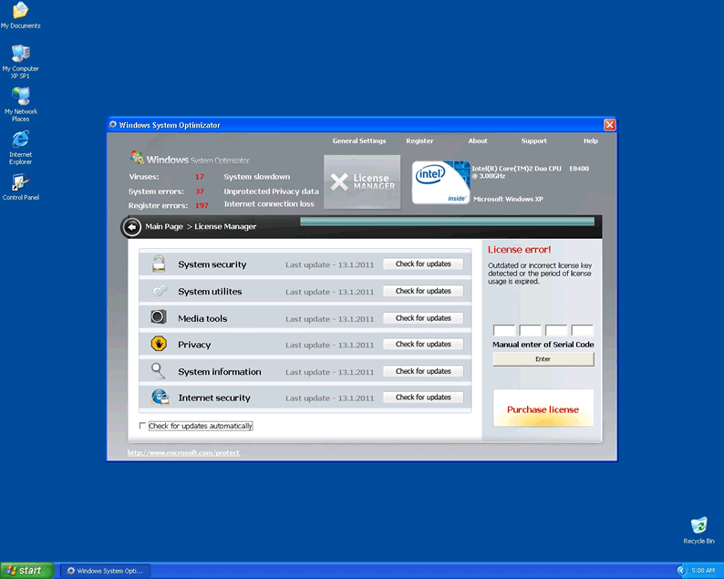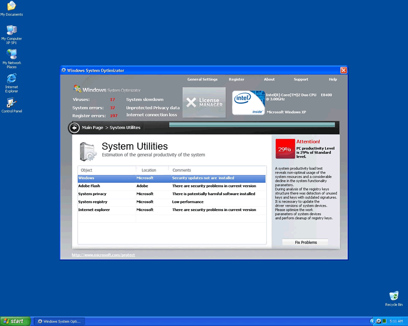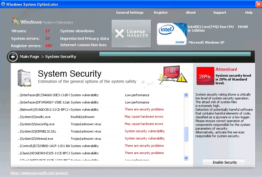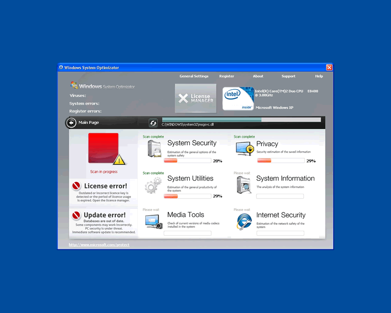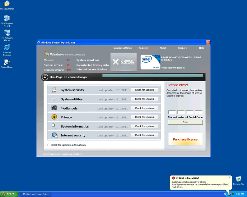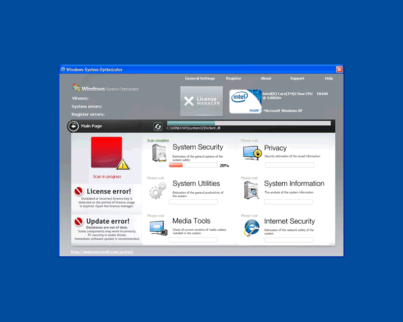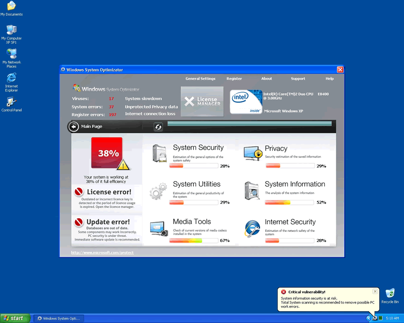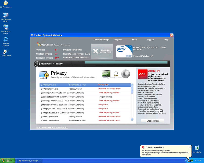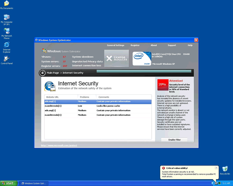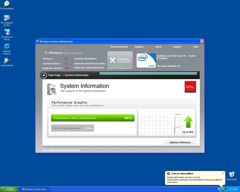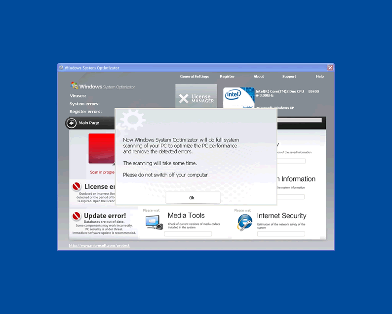 Windows System Optimizator is clearly a fake system scanner designed by hackers to pilfer money from unwary computer users. Windows System Optimizator acts like a scanner and has the ability to block computer users from accessing Microsoft and task manager. WindowsSystemOptimizator blocks user access to all programs and will not allow the hapless victim to open any security programs that might lead to its termanation. The rogue malware remover will produce fake popup warnings claimimg the compuetr has been infected with parasites. Then it continues by urging the user to purchase a license using a fake Microsoft page and logo to seem convincing.