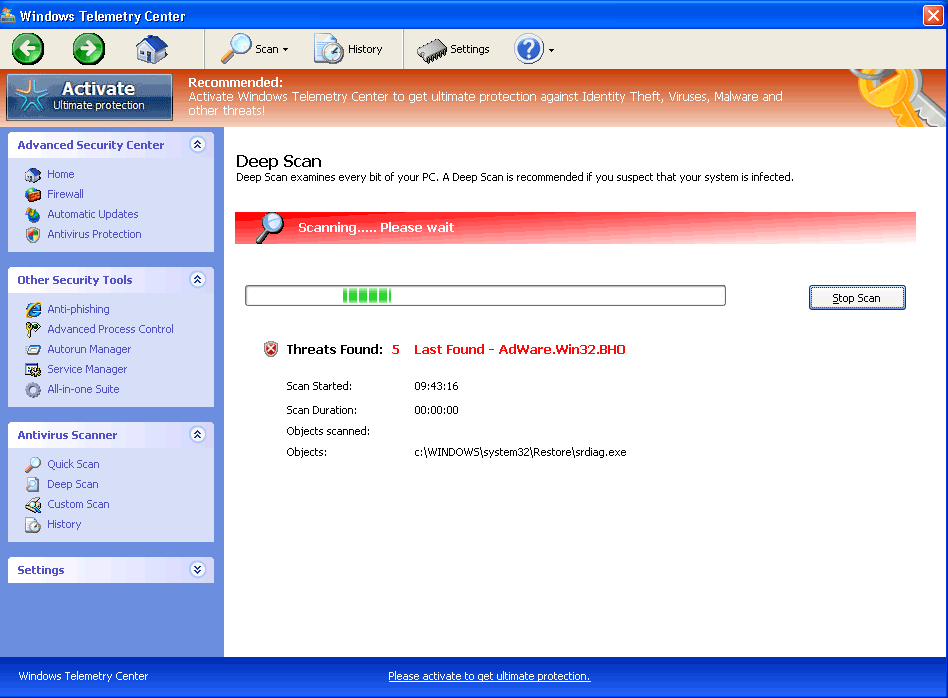Although Windows Telemetry Center's name, marketing and supposed update features all imply that Windows Telemetry Center is a legitimate anti-malware program that uses regularly updated threat definitions to detect and uproot malicious software, SpywareRemove.com malware analysts note contrarily that Windows Telemetry Center actually is a fairly self-contained application. Windows Telemetry Center doesn't have a genuine database of definitions for PC threats, nor does Windows Telemetry Center truly attempt to detect viruses, Trojans or other types of harmful software during its scans. Instead, scans and a variety of pop-up alerts are created automatically with randomly-generated warnings to create the illusion that your PC is always under the looming shadow of multiple infections.