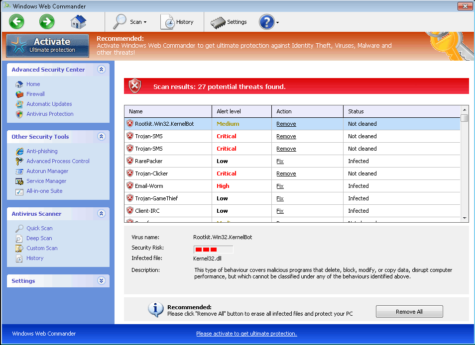 Fake security features are the hallmarks of Windows Web Commander and identical FakeVimes-based scamware like Privacy Guard Pro, Extra Antivirus, Fast Antivirus 2009, Presto TuneUp, Windows Security Suite, Smart Virus Eliminator, Packed.Generic.245, Volcano Security Suite, Windows Enterprise Suite, Enterprise Suite, Additional Guard, Live PC Care, PC Live Guard, Live Enterprise Suite, Security Antivirus, My Security Wall, CleanUp Antivirus, Smart Security and PrivacyGuard Pro 2.0. Nonetheless, these aren't Windows Web Commander's only capabilities or even its most dangerous ones, and SpywareRemove.com malware researchers also recommend that you guard your PC against: