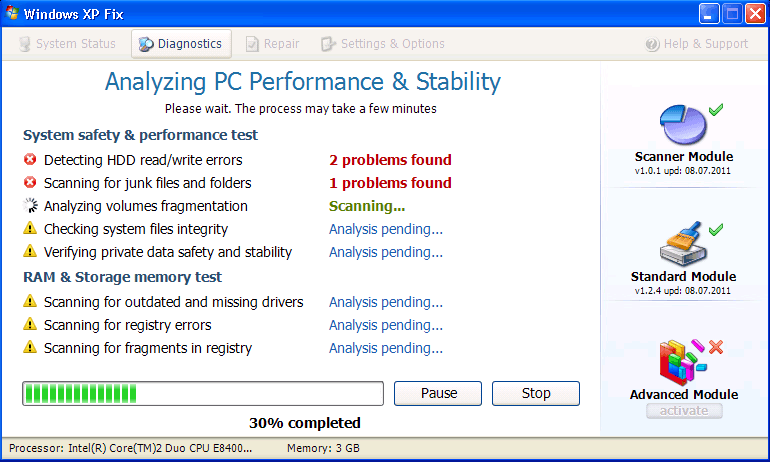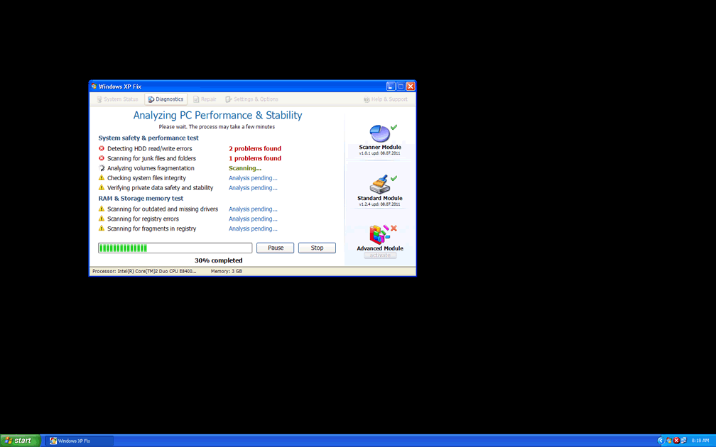 Windows XP Fix is a defragmentation tool that creates fake infection warnings to convince you that a small army of Trojans, viruses and other PC threats are attacking your computer. Contrary to Windows XP Fix's repeated alerts, none of the infections that Windows XP Fix warns you about are present, and Windows XP Fix itself has no ability to remove them. Other issues that you may face until you've removed Windows XP Fix can include file display errors, program crashes and browser hijacks. You should delete Windows XP Fix by making use of a legitimate anti-virus program rather than trying to remove the files yourself whenever this is possible.