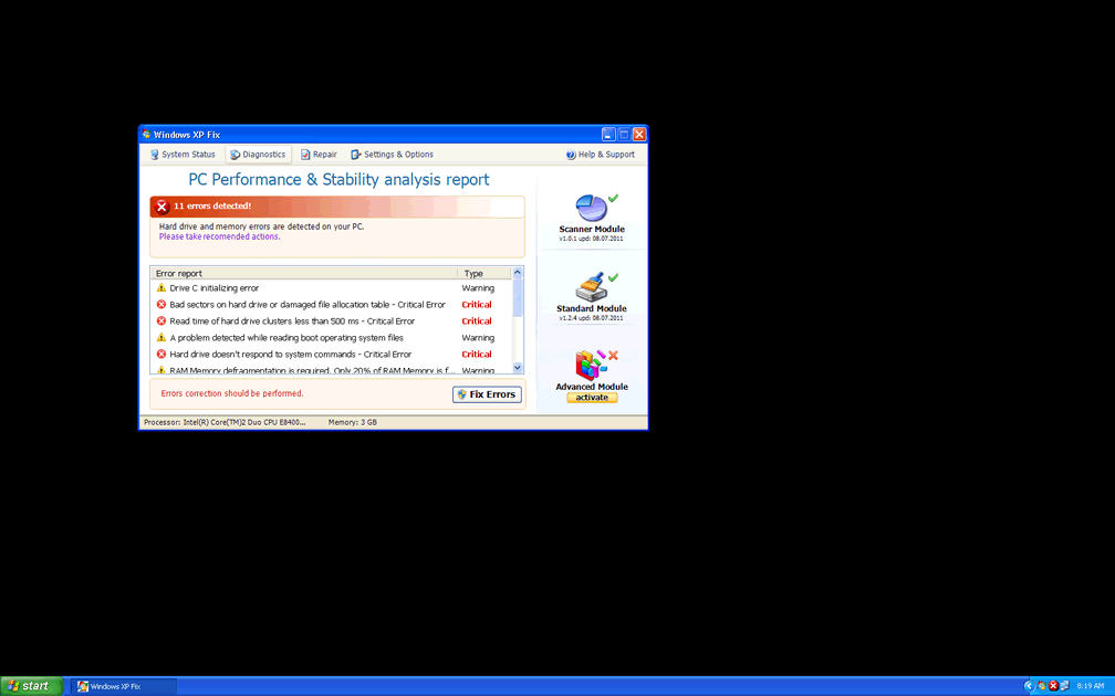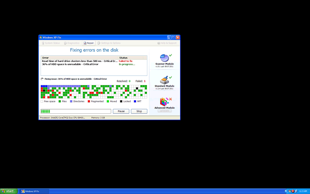 Windows XP Fix is a direct copy of other rogue defragmenter, including Windows Disk, Windows Fix Disk, Win Defragmenter and System Defragmenter. Both Windows XP Fix and its clones will pretend to scan your PC for potential hard drive errors, and come up with unnerving results like the following: