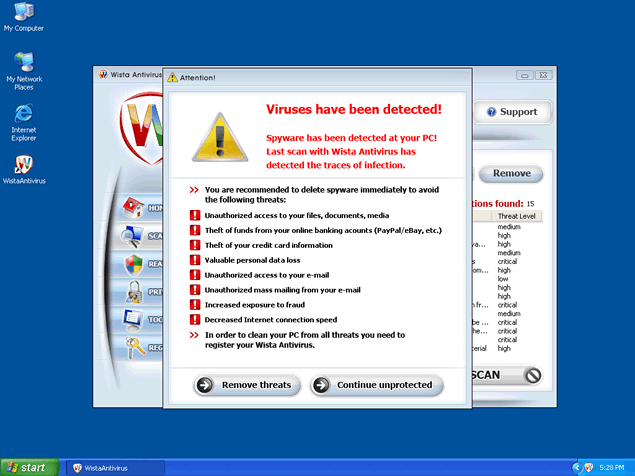 WistaAntivirus, or Wista Antivirus, is a rogue anti-spyware program and a clone of WinDefender 2008. Wista Antivirus may be installed by a Trojan infection called Zlob. WistaAntivirus is known to display popups and system notifications warning computer users of an infection. This is usually a bogus attempt to get you to purchase the WistaAntivirus program.