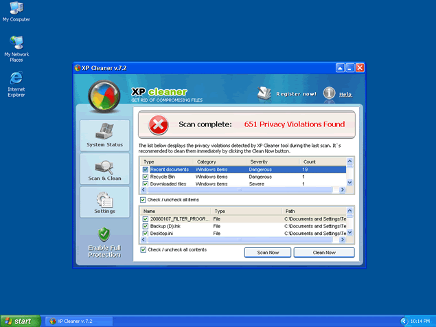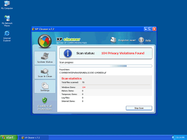 XP Cleaner is a corrupt anti-spyware application that may be downloaded and installed onto your computer by a Trojan.Zlob that compromises your security system via its vulnerabilities, or can be downloaded directly from www.xpcleanerpro.com. After XP Cleaner is installed, it will display fraudulent error messages, stating that your computer is infected with spyware and adware applications. XP Cleaner will then offer you to remove the parasites it "found" if you purchase the non-existent full version of the program. It is strongly recommended to remove XP Cleaner from your system without any hesitation, for it will only consume your computer's processing power.