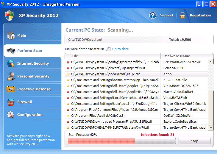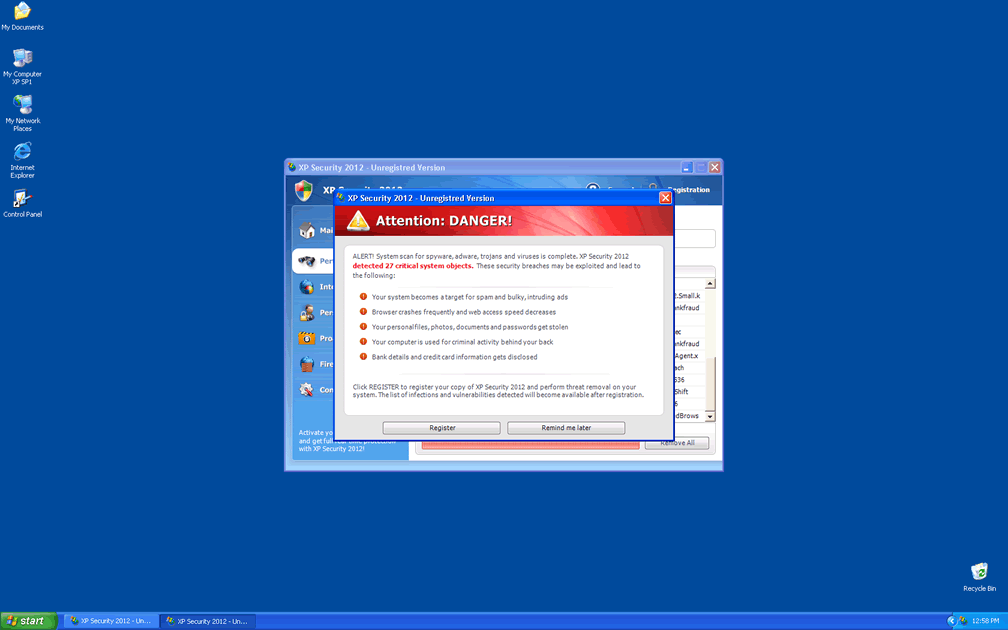 Like the above PC threats, XP Security 2012 also uses imitations of system scans and infection warning pop-ups to mislead you about the state of your PC's health. Regardless of how few infections are on your PC, XP Security 2012 will always announce that it's found many different attackers that can only be deleted if you purchase XP Security 2012. The purchasable version of XP Security 2012 isn't any more able to delete or detect threats to your PC than the 'free' version is, so you should save your money.
