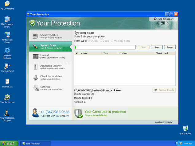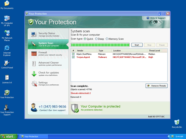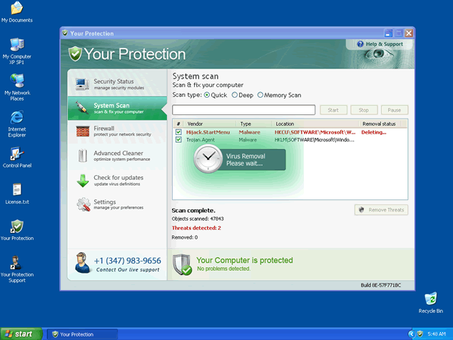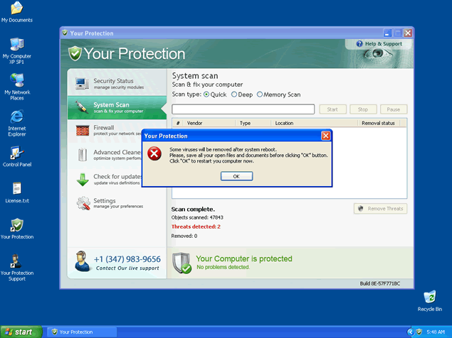 Your Protection is also known to black other legitimate anti-virus or anti-spyware programs. It may be very difficult to attempt manual removal of Your Protection. When installed, Your Protection may initiate system scans that return bogus results. It is very important to take immediate action to remove Your Protection completely from the affected computer.
